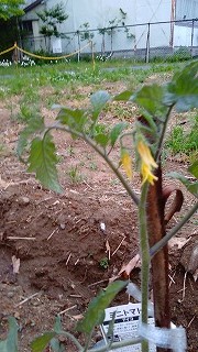 s-20160516 18.27学校の園芸場のミニトマトに花がついています。生徒たちが当番となり交代で水をくれています。「水くれ当番」です。水遣り当番とどちらがなじみが深いでしょう。えさくれ当番とえさやり当番とか・・・水くれ、えさくれ、というと???という人もいるようです。生徒たちの愛情がこもった作物の収穫が楽しみです。現在、ミニトマトの他にジャガイモ、ナス、カボチャが植えられています。※写真はミニトマト(担当:1学年)