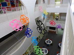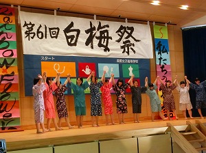 白梅祭が終わり、彩っていた飾りつけも撤収し、平穏な時を刻んでいます。1学期も残り2日。白梅祭の成果発表で得たものを学校生活に繋げ、充実した日々を過ごしてほしいと思います。写真は、美術班による吹き抜けアート作品と生活文化コースファッション造形基礎による甚平ファッションショーの様子。(担当:2学年)
