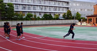 ※3学年のバスケットボールの練習風景(写真上)と1学年のリレーの練習風景(写真右)(担当:1学年)