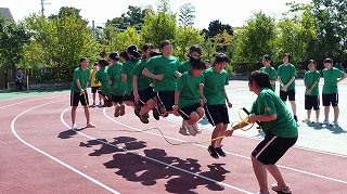 ※(写真上)1年生クラス対抗リレーのスタート!(写真右)大縄跳び