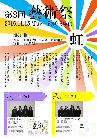平成28年度の藝術祭、合唱コンクールが行われています。課題曲1曲とクラスで選んだ自由曲1曲の2曲を合唱演奏し発表します。指揮者、伴奏者もこの日を目指して練習を積み重ねてきました。果たして結果はいかに・・・。画像は情報メディアコース2年生が制作したパンフレットです。保護者の皆様にもお越しいただいています。お楽しみください。(担当:1学年)