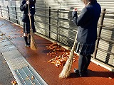 明日はダンス班がダンスドリル秋季競技大会甲信越大会に出場します。日々の練習の成果を存分に発揮してほしいと思います。 写真は、登校時間に学校周辺の落ち葉掃きを行っている生徒達の様子です。(担当:事務)