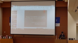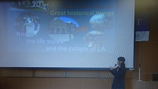 スピーチは「Enjoy! Wonderful Los Angeles –focus on high school STUDENTS-」と題し、修学旅行先であるロサンゼルスの「文化・地域・人々」をテーマに、異文化を学ぶことのよさをロサンゼルスの見所や過ごし方を紹介しながら伝える、というものでした。(担当:英語活動)