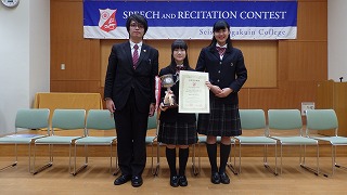 昨日(11月13日)は清泉女学院大学において「第13回長野県高校生英語スピーチ・レシテーションコンテスト」(主催清泉女学院大学/長野市)が行なわれ、本校から参加した2学年の笠原佑菜さんがスピーチ部門で見事優勝し、併せて長野県知事賞を受賞しました。