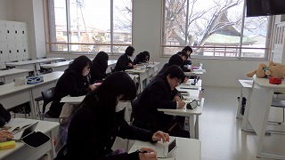 毎週木曜日の放課後は、「放課後学習会」があります。実施されている教科は英語で、主にセンターに向けての基礎知識を培っています。2・3年生の進学コース生と1年生の進学コース生の有志が参加しています。3年生がセンターを終えてからも、継続的に行っており、1年後に迫るセンターに向けて力を高め「志望校に少しでも近づけるように力を高めたい」と日々、勉強に励む姿が見られます。(担当:3学年)