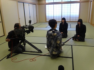 今日は、長野朝日放送で放送されている「きものdeキャンパス」という番組の収録が行われています。『普段、着物を着る機会が少ない女子学生に”憧れの着物”を着てもらう』という内容で本校もお声をかけていただきました。今回は、3年生の代表生徒2名が出演いたします。事前のインタビューではドキドキしながらも、これから着付けをしてもらうことへの期待感もうかがえました。
