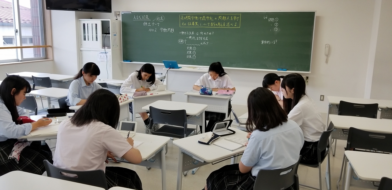 昨日から夏期講座がはじまりました。大学入試をひかえた受験生を中心に、今日も多くの生徒が登校しています。進学対策講座「社会」の時間では、推薦・AO入試等で問われる小論文や面接における頻出テーマの学習をおこなっています。