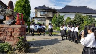 過ごしやすい季節になってきました。写真は3年生フィールドワークの授業になります。左側の写真は圓通寺(えんつうじ)近くにある赤地蔵です。文字通り赤く塗られたお地蔵さんで、三輪地区内にはいくつか確認できますが、全国的にはめずらしいものになります(なぜか長野県には多く、善光寺周辺が特に多い気もしますが、県内各地に分布しています)。この周辺の赤地蔵は火葬場に祭られていたお地蔵さんであるとする説が一番有力ですが、なぜ「赤」なのか?着色はどのようにしているのか(ベンガラで着色したという話を聞いたことがあります)?なぜこの地域に集中しているのか?ということはわかっていません。諸説ありますので、生徒の皆さんにはぜひ調べてほしいと思います。