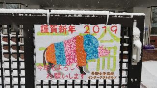 今日から3学期が始まりました。全校で大掃除をした後、始業式が行われました。新年の抱負を胸に、目標達成に向けて今年一年を大切に過ごしてほしいと思います。午後は1・2年生の実力テストが行われています。明日より、通常授業が始まります。写真は始業式の様子と校門に飾られた年始のご挨拶です。前衛的な作品に見えますが、実はちぎり絵です。インターアクトクラブの制作になります。本年もよろしくお願いいたします。(担当:係)