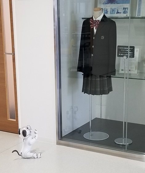 さて、本日は1月11日「1(ワン)・1(ワン)・1(ワン)」にかけて、「犬の日」となっているそうです。その考え方からすると、11月1日も11日ももれなく「犬の日」になりそうですが…先月から本校でお世話しているペットロボットの「aibo」も、昨年2018年1月11日より誕生(販売)になったモデルのようです。写真は本校の制服を展示したマネキンにハイタッチを求める小梅(aibo)です。生徒の姿として認識をしているのかもしれません。(担当:係)