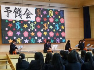 今日は、推薦入学試験に合格し、本校への入学が内定されたみなさんの入学手続きが行なわれました。4月から始まる新しい生活に向けて気持ちも一入かと思います。残りの中学校生活をしっかりと仕上げてください。さて、先週もお伝えした予餞会が迫ってきました。主催する生徒会も熱が入っています。今年はどんな出し物で3年生を送るのか、気持ちのこもったあたたかい送別会になることを期待しています。また、当日は大勢が一堂に集まる会になります。インフルエンザウイルス等の感染には特に注意しましょう。(画像は昨年の予餞会、「琴」の発表です。担当:教務)