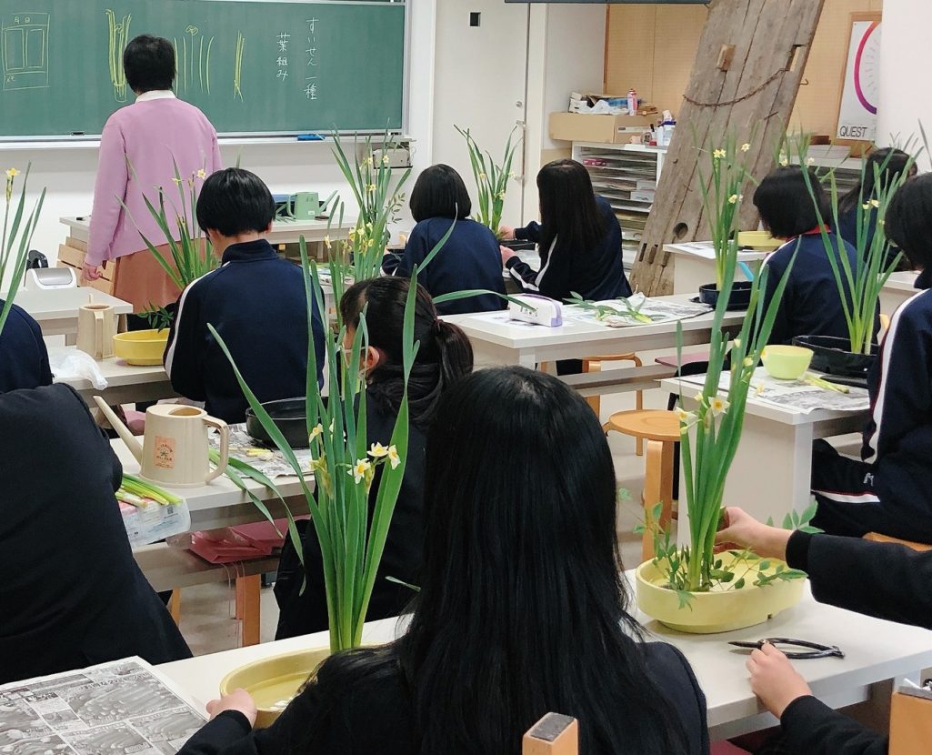 普通、水仙は花のほうが葉よりも位置が高いのですが、華道では葉組ということを行い、花よりも葉のほうを高くするのだそうです。生徒たちはバランスを見ながら思い思いのイメージを抱きながら生けていたようです。和の心に触れる時間でした。(担当学年:2年)