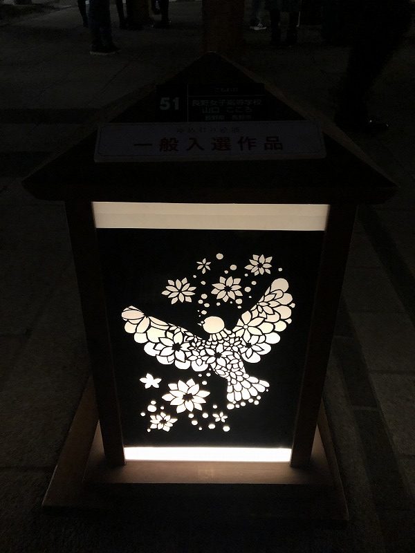 先日開催された第17回長野灯明まつりの「ゆめ灯り絵展」には、本校生徒も毎年作品を出展しています。ゆめ灯り絵は、善光寺へと続く表参道を800基の切り絵灯篭が照らす美しい情景です。今年は学生部門に10作品、一般部門に1作品を出展し、このうち見事1作品が学生最優秀賞に輝き、2作品が学生部門・一般部門でそれぞれ入選しました。写真は受賞作品です。長野灯明まつりのホームページからもご覧いただけます。(担当:事務)