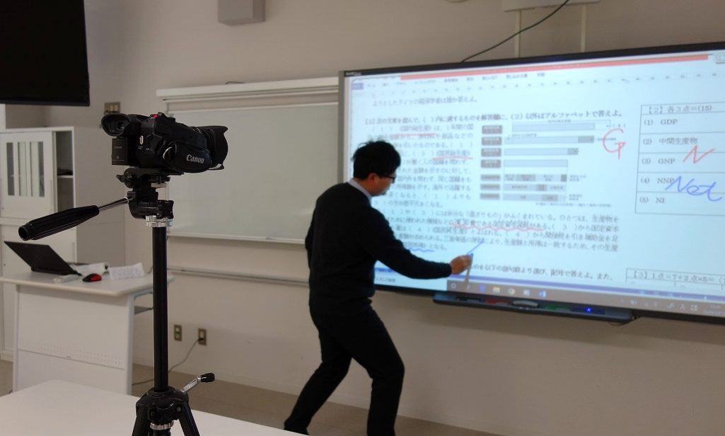 そして、今回はさらにオリジナルの学習動画も制作して配信しました。休校の関係上、返却ができていない学年末テストの解答・解説を授業したものになります(1学年の現代社会の授業)。テスト問題を電子黒板に投影し、問題文を読み解きながら解説を行いました。家庭での学習に役立ててほしいと思います。(担当:1学年)。