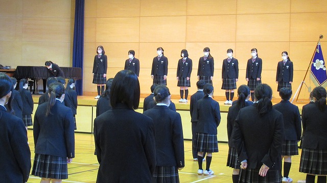先週、生徒会役員選挙の立会演説会と投票が行われ、生徒会長をはじめとする8名の新たな役員が選出されました。本日の全校集会では新役員が紹介され、生徒会長は「より良い学校作りに努めていきたい」と意気込みを示しました。これまで全校の先頭に立ち学校を盛り上げてくれた3年生役員のみなさん、おつかれさまでした。そして、ありがとうございました。本日より新生徒会が始まります。これまでの伝統を引き継ぎつつ、学校に新しい風を吹かせ活躍してくれることを期待しています。全校で協力していきましょう。(担当:事務)