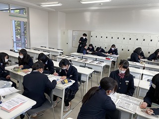 1学年の総合では、各グループに分かれて探究活動を行いました。新型コロナウイルス感染症と現代社会に関わりがある出来事の中から担当になったテーマを基に、課題を設定して、情報収集を行い、整理・分析作業に取り組んだ後、自分達のまとめたものを発表というスケジュールで動いています。