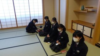 2学期最後の茶道の授業では、亭主や客など役割を分担してお茶会を行いました。茶道の授業を始めてまだ2か月、お互いに作法を確認しながら1つひとつの所作を丁寧に行いました。季節を楽しむ主菓子は、クリスマスツリーをイメージしたもので、和菓子の優しい色合いと繊細な美しさに生徒たちの気持ちも高揚していました。(担当:2学年)