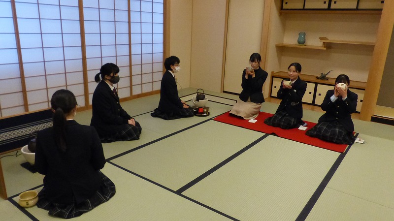 3学期最後の茶道の授業では、担任の先生をお招きしてひな祭りの茶会を行いました。主菓子はよもぎと桃色が春らしい「引千切(ひきちぎり)」、掛軸、棗もおひな様柄でおもてなしです。生徒たちは緊張した面持ちで、主人・半東・点前・客などの役割を分担して行いました。始めの頃はたどたどしかった所作も、約半年間茶道を学び、一つひとつの動作を落ち着いて行えるようになりました。和やかな雰囲気の中で、おもてなしの心が伝わってくる茶会となりました。(担当:2学年)