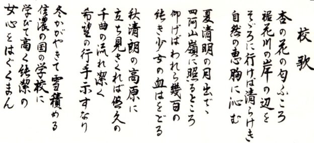 確かに歌詞をよく見ると、すべて4小節で七・五調になっています。そして、当時校舎の置かれていた長野市岡田町(裾花川畔)の四季の移ろいが、春夏秋冬の四節(1~4番)にまとめられています。先ほどの老川先生の回顧では「すべて想像ではなく自分の体験し凝視した自然を自由に歌った」と述べられています。自然の清らかさと生徒の純真さを対比させているようにも感じます。素朴で率直な表現はアララギ派の作品に通じるものがあります。