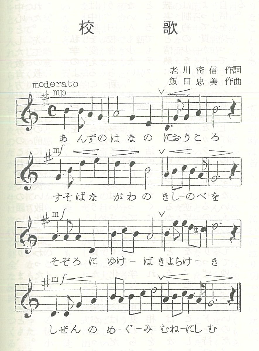 作詞を担当された老川密信先生の回顧(「校歌によせて」『白梅 創立40周年記念号』1965年発行)によると、校歌がつくられたのは1954(昭和29)年のようです。当時、老川先生は本校の校医を務めておりましたが、その一方で、アララギ派の歌人としてもご活躍されていたそうです。アララギ派は正岡子規の門下生たちを中心とする短歌の歌人グループになります。一般的には写実的で、生活に密着した作品が多いとされます。