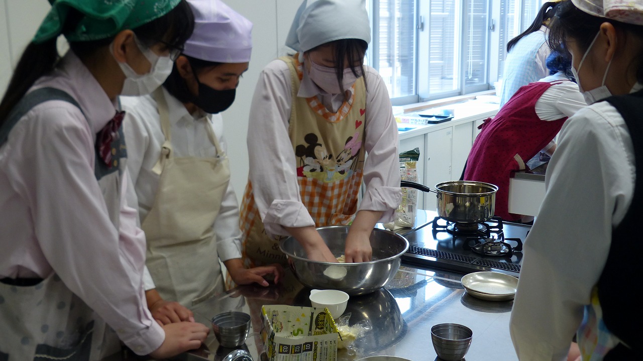 3年生のフードデザインの授業では、新型コロナウイルス感染対策をしながら、パン作りをしました。グルテンの性質やイースト菌の性質を学んだ上での実習でした。