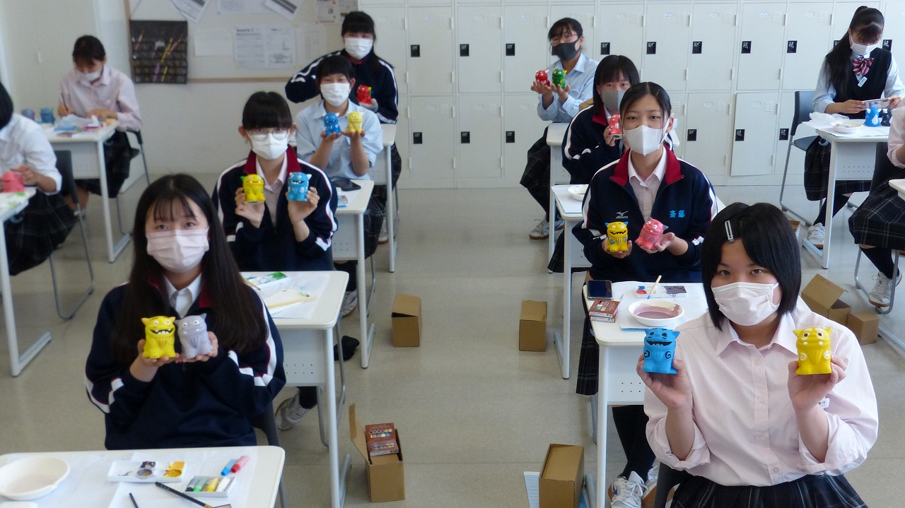 3学年は、今年度の修学旅行の代替活動として、琉球村から取り寄せたシーサーの絵付け体験を行いました。各自がオス・メス対の2体に色を付けました。シーサーは沖縄の守り神であり、赤は勝負運、黄色は金運など、色によって呼び込む幸せが違うと言われています。各々が願いを込めて色を塗りました。目や耳、色や模様を工夫し、それぞれの個性が光る作品に仕上がりました。(担当:3学年)