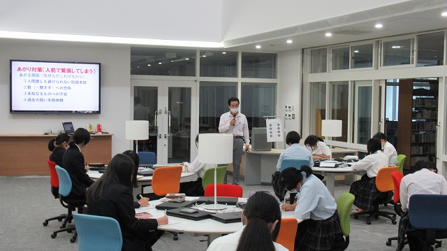 2学年を対象に、キャリア教育特別講座を行いました。長野女子短期大学の坂口先生をお招きし「社会と自分のつながり、自分自身と向き合う」というテーマで講演をしていただきました。9月に実施した特別講座の第2弾となります。話を聞くこと伝えることの技術や、コミュニケーションタイプ別の特徴と関係性など実践を交えて教えていただき、当事者として考えながら学ぶことができました。生徒たちはメモを取り、うなずきながら真剣に聞いていました。今後多くの人と関わっていく中で、お互いの特徴を認め合い、自分の特性を生かしていきましょう。(担当:事務)