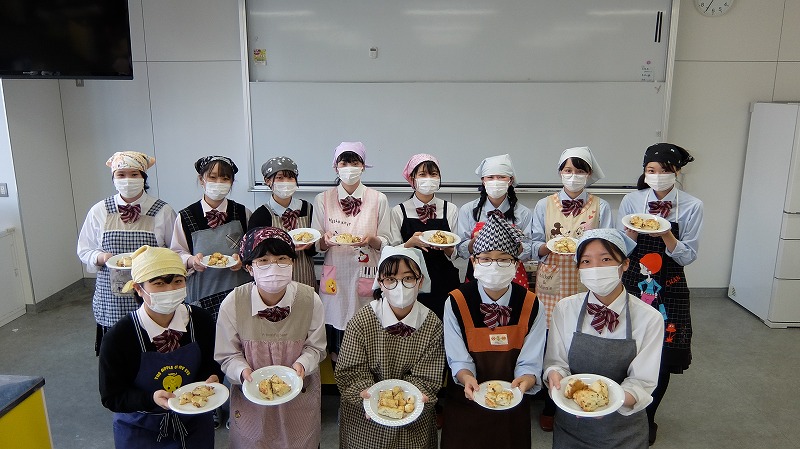 3学年のフードデザインの授業では、食品の性質と調理についての学習をしています。小麦粉・乳製品・油脂の性質と調理について学んだ理論を生かした方法での実習です。感染症対策に配慮した短時間でできるスコーンを作り、ふんわり・さっくり・しっとりの3重層と3重奏を楽しみました。(担当:教務)