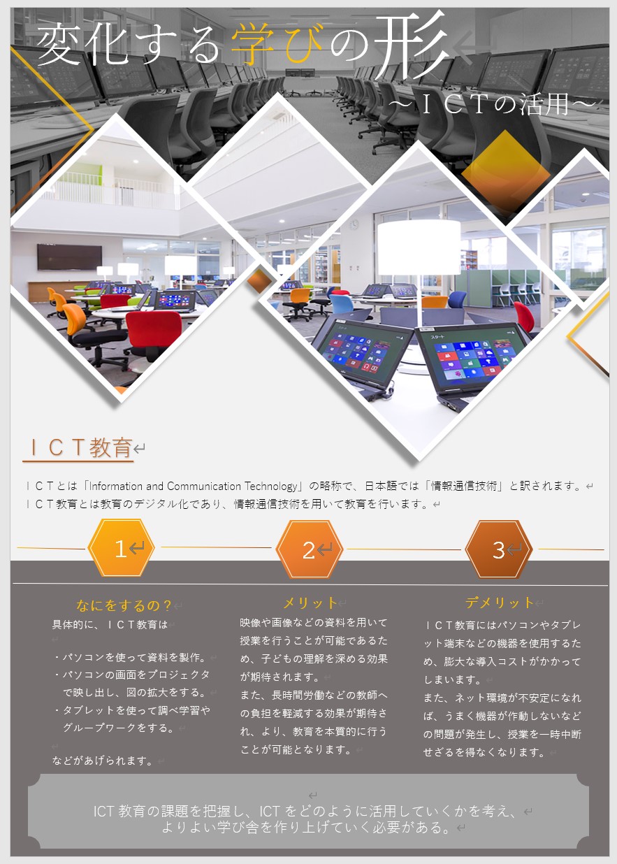 2学年の情報メディアコースでは、日本情報処理検定協会が主催する第12回文書デザインコンテストに参加しました。「学び舎」をテーマに各々、作品を作り、作品制作を取り組む中で、著作権について理解を深め、文書作成ソフトウェア活用能力と自分の考えを表現する力を向上させたことでしょう。応募作品の中で2学年の生徒の作品が、1480作品の中から佳作に選ばれました。左の写真は佳作に選ばれた生徒の作品です。一生懸命取り組んだことが実を結ぶような良い経験をしたのではないでしょうか。今後も様々なことに、諦めずに努力してほしいです。