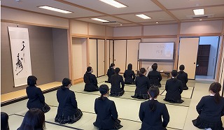 2学年では、学校設定科目の礼法科「茶道・華道」の授業を行っています。日本の文化やしきたりや学ぶこと、作法を身に付け、花や茶に真剣に向き合うことで思いやりや落ち着きのある心を育むことを目的としています。写真は1回目の茶道の授業で、和室での決まりと動作を学んでいる様子です。茶道の精神を理解し、お稽古を重ね、盆略点前が美しく出来るようになる日が楽しみです。