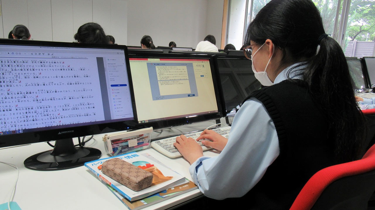 1年生の情報の授業では、タッチタイピングの練習や、文章の作成について学習をしています。タッチタイピングは、毎回の授業で少しずつ練習しているため、上達してどんどん速く正確に入力できるようになってきました。タイピングのスピードを高めることや、パソコンを用いて文章を作ることは、卒業後も役立つ技能です。今後も練習に励み上達させていきましょう。