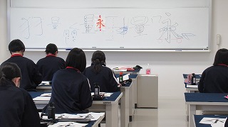 1年生の書道の授業では、筆の持ち方や筆の運び方を、一人ひとりが先生から丁寧に教わっています。とめ・はね・はらいの 基本技法を身につけるため、今は「永」という漢字を書いています。先生の説明を聞き、ゆっくりと丁寧に集中して書いていました。書道の授業を通して、日本ならではの美しいかな文字や漢字を見つめ直すことで伝統文化を体感でき、文字を書くことがより身近に感じられるようになることと思います。