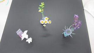 2年華道の授業では、極小のいけばな『ミニアチュール』(植物のある部分を抽出していけたものを複数組み合わせて構成)を学びました。透明チューブやカラーゴムを使って、折り曲げたり結んだりしながらイメージを膨らませ、小さな花器を作りました。花弁、葉、茎などを切り取って花器にいけ、小さなonly oneの世界をつくり上げました。この作品は白梅祭で展示する予定です。