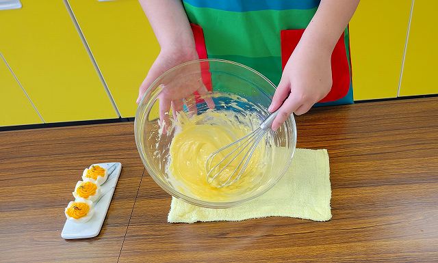 3学年「フードデザイン」の授業では、卵の調理上の性質について学びました。今回は熱凝固性と乳化性の実験を行いました。卵黄と卵白の凝固温度の違いを利用することで多様な調理ができること、卵黄中のレシチンのはたらきでマヨネーズができることを学びました。マヨネーズには7割も油が含まれていることを知り、摂取の仕方についても考える機会となりました。