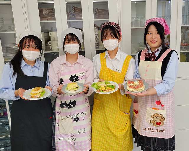 3学年「フードデザイン」の授業では、小麦やとうもろこし、卵の性質と調理について学んだ内容を活かし、イングリッシュマフィンを焼きました。生地にコーングリッツを付けてフライパン焼きで、簡易な方法で仕上げました。それを使って各自で工夫した具材で盛り付け、テーブルコーディネートと写真撮影を行いました。エッグベネディクトにしたり、秋が旬の食材を使ったりと、工夫が見られました。