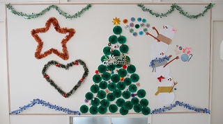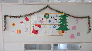 学芸委員会の企画による壁画装飾が各クラスで行われています。 ホール側の壁にクリスマスの飾りつけをし、気分を盛り上げています。 終業式の日にはお楽しみ会も行われ、冬休みに入ります。 インフルエンザも流行りつつありますが、年内の登校日も残り3日、 体調を整えて残りの学校生活を送り、気持ちよく新年を迎えましょう。