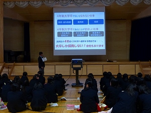 写真は校内の吹き抜けに飾られた巨大なリースと、土曜日に一学年を対象に行われた「進路ガイダンス」(逆算して進路を考えよう)の様子です。(担当:一学年)