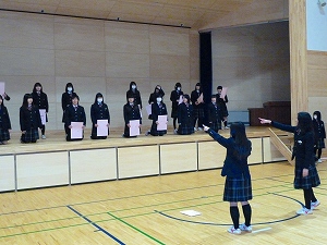 今朝の長野市内は薄っすら雪が積もり立春が過ぎたとは言え、まだまだ寒い日が続いています。しかし、朝夕の日の長さは着実に長くなってきて、待ち遠しい春が一歩ずつ近付いてきています。さて、先週もお知らせしましたが、土曜日の午後、1・2学年の懇談会が行われました。2学年はいよいよ近付いてきた修学旅行とそして進路について、生徒と保護者の方にお集まりいただいて全体会を行いました。特に修学旅行については、旅行代理店の方も来ていただいて、下見の写真を見ながらの日程確認、事前学習の進捗状況、今後必要な各種申請、そしてスーツケース等々について説明させていただきました。保護者の方からは、パスポート、ホームステイ先へのお土産、携帯電話など幾つかの質問が出て、お互いに情報共有ができ、内容の濃い会となりました。ところで、写真は今週の金曜日に行われる「予餞会」に向けた準備と発表練習の様子です。1・2年生は学習やクラブ活動の成果を、しっかりと発表し、去り行く3年生に向け、思いのこもった餞別となるよう頑張ってください。(担当:2学年)