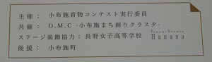 先日お伝えした「小布施着物コンテスト」のステージ装飾のためのピンワーク。3/16(日)に行われた本番のステージに飾らせていただきました。総合文芸部美術部門の生徒が製作した看板もホールの入り口に飾っていただきました。どちらも実行委員会の方に喜んでいただけたり、来場されていたお客様が作品の写真を撮られる姿が、生徒にとって励みになりました。また、当日はリハーサルを見学させていただき、プロのテキパキとした動きやたくさんの人が関わってステージが作られる様子に刺激を受け、自分たちの今後の活動に夢を膨らませる1日となったようです。(担当:1学年)