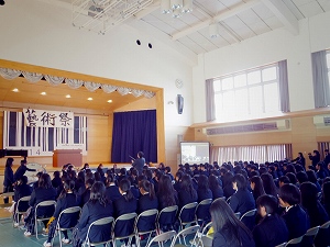芸術祭は「文化系活動の発表の場」と「各クラスによる合唱披露」により構成されており、合唱については全校の課題曲である「旅立ちの時~Asian Dream Song~」(作詞:ドリアン助川 作曲:久石譲)と自由曲の発表です。