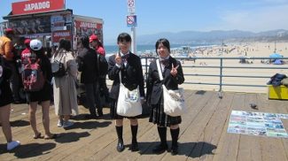 vol.7 ロザンゼルス到着(LA10:00/日本02:00)4月18日(木)16:20定刻どおり羽田空港を出発し、先ほど予定よりすこし早めの現地時間4月18日(木)9時半過ぎ(日本時間4月19日午前1時半過ぎ)にロサンゼルス空港に到着しました。機内では睡眠、休養を取るように心がけました。先程、日本で何度もシュミレーションしてきた、緊張の入国審査を終えました。非常に混んでいて、システムが変わったところもあり、入国審査に約2時間かかりました。今はロサンゼルス空港を後にし、毎年お世話になっているJTBの現地ガイドさんの案内で、バスでLA市内観光に出発しました。LAで1番有名なビーチ・シティ サンタモニカを散策し、ファーマーズマーケットに向かっています。各自昼食を買い、ショッピングなどを楽しみます。
